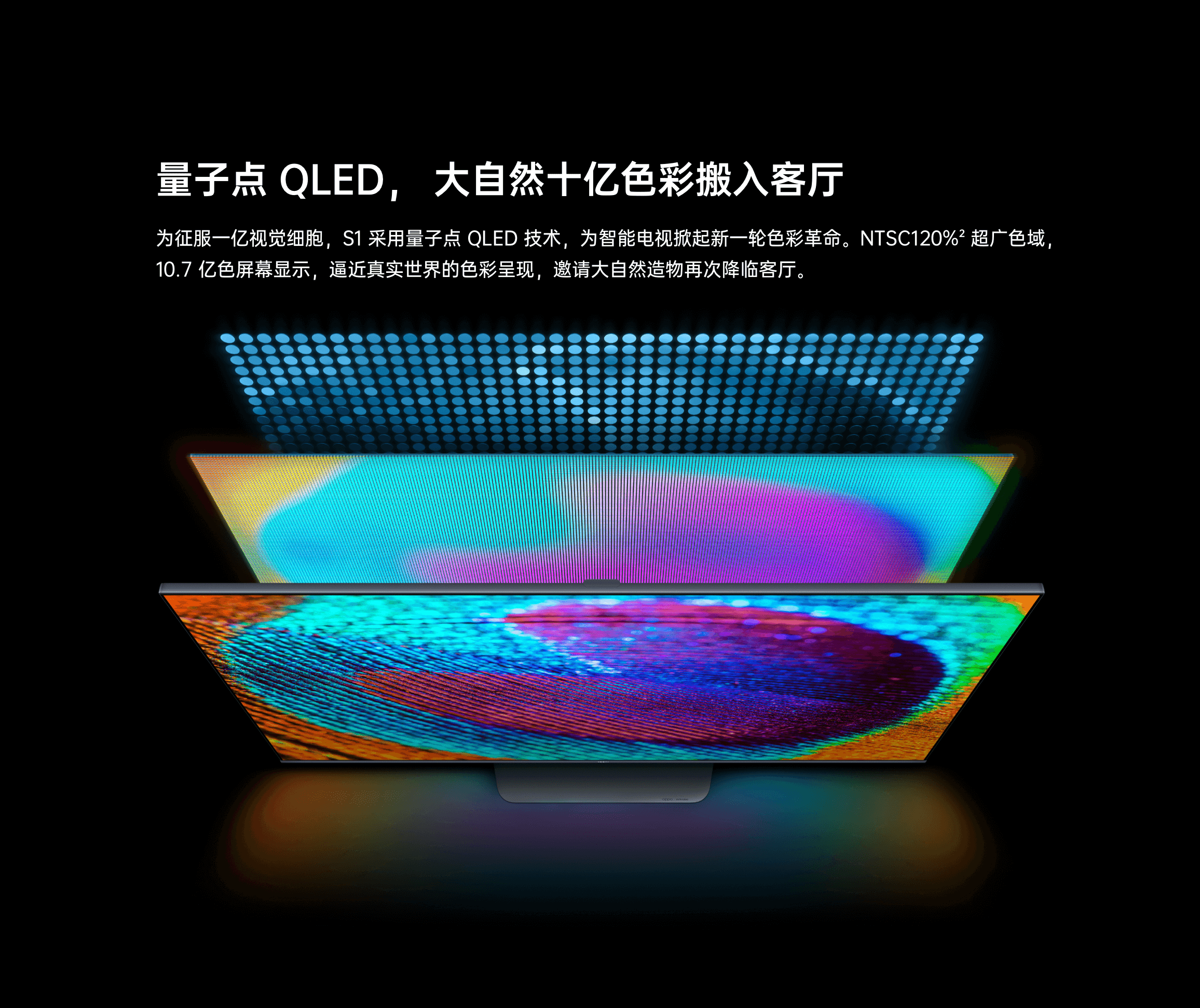 OPPO推出的量子點智能電視S1,采用量子點QLED技術,為智能電視掀起新一輪色彩革命。該款電視支持NTSC 120%超廣色域,10.7億色屏幕顯示,逼近真實世界的色彩呈現,邀請大自然造物再次降臨客廳。